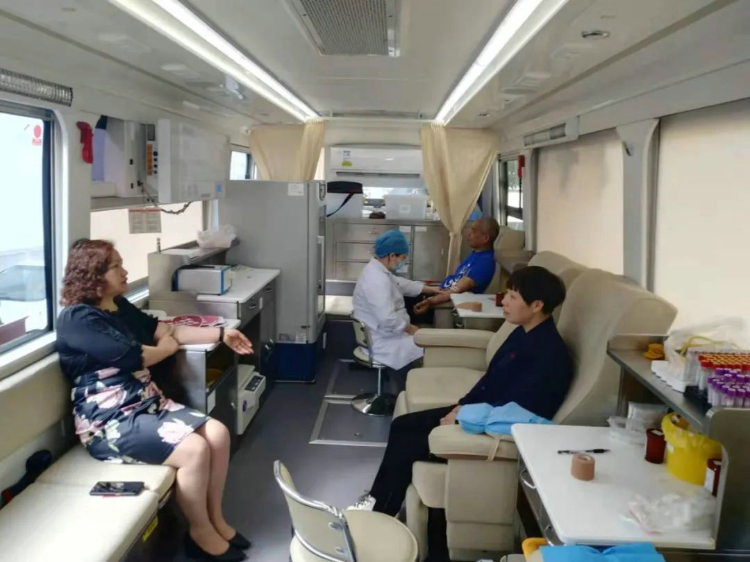 A imagem mostra o veículo móvel de doação de sangue do Banco Central de Sangue de Shengzhou